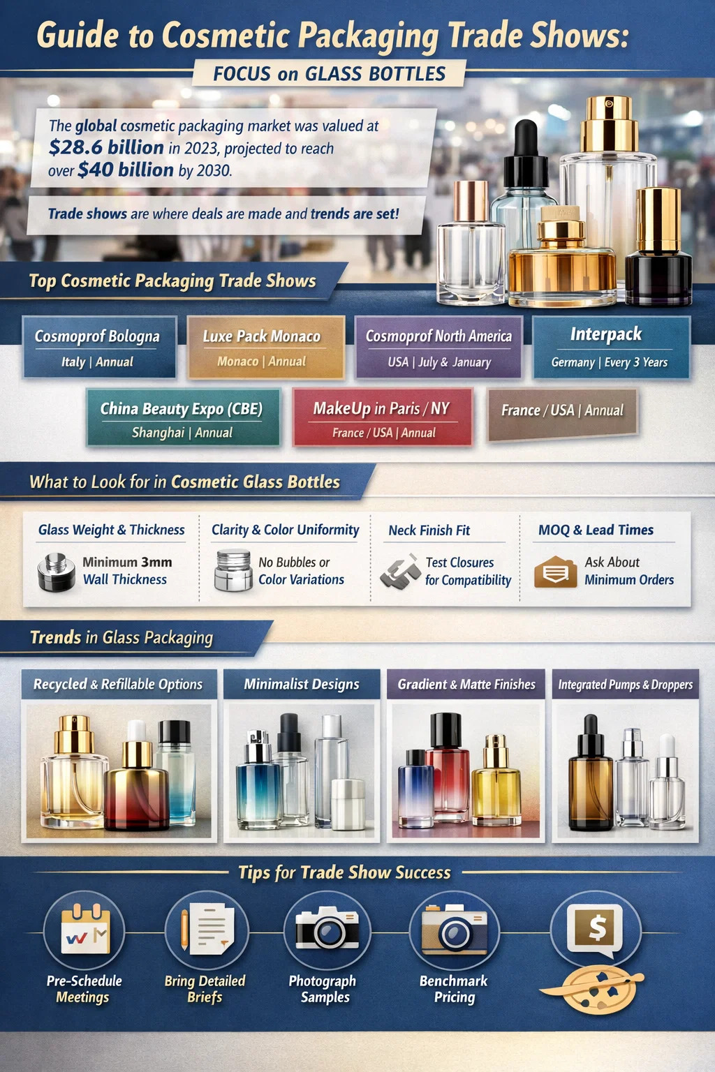 إذا كنت تقوم بشراء مواد التعبئة والتغليف لمنتجات مستحضرات التجميل - وخاصة المواد المتميزة مثل زجاجات مستحضرات التجميل الزجاجية — يعد حضور المعارض التجارية الصحيحة أحد أكثر القرارات التي يمكنك اتخاذها كفاءة. في مكان واحد، يمكنك مقارنة مئات الموردين، والتعامل مع العينات المادية، والتفاوض على الأسعار مباشرة، وبناء علاقات تستغرق أشهرًا لتكرارها من خلال التواصل عبر البريد الإلكتروني. تم تقييم سوق تغليف مستحضرات التجميل العالمية بحوالي 28.6 مليار دولار في 2023 ومن المتوقع أن تصل قيمتها إلى أكثر من 40 مليار دولار بحلول عام 2030، وفقًا لشركة Grand View Research. المعارض التجارية هي المكان الذي يتم فيه تشكيل جزء كبير من هذا السوق - حيث يتم عقد الصفقات، وتحديد الاتجاهات، وبناء شبكات الموردين.