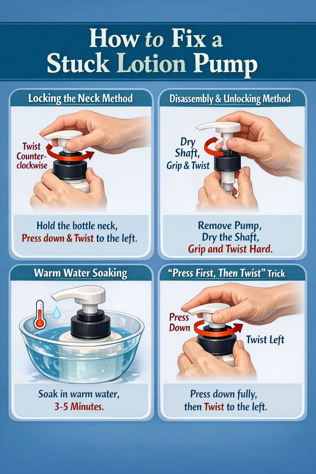 التعليمات: حاول الضغط على رأس المضخة بالكامل للأسفل دون تركها. أثناء الضغط عليه، قم بتدويره في اتجاه السهم (عادة عكس اتجاه عقارب الساعة). في بعض الأحيان، يمكن لـ "تحرير الضغط" هذا تنشيط آلية الزنبرك الداخلي على الفور.