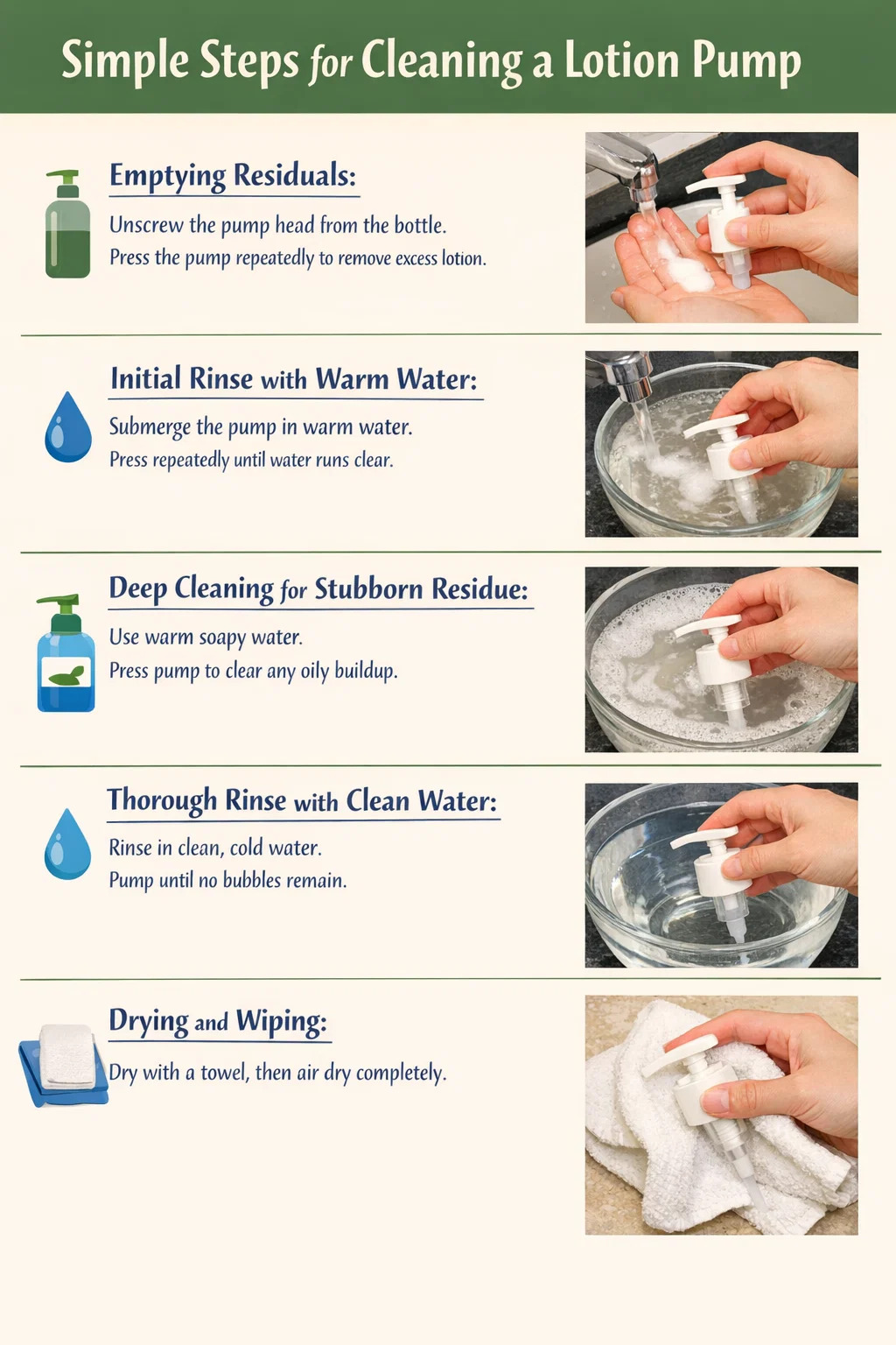 قم بإعداد حوض من الماء الدافئ (لا تستخدم الماء المغلي، لأن ذلك قد يؤدي إلى تشويه البلاستيك). اغمري مضخة المستحضر بالكامل في الماء، مع الضغط على المضخة بشكل متكرر أثناء غمرها. سوف ترى المستحضر الأبيض يتوزع من الأنبوب مثل سحابة صغيرة. استمر في الضغط حتى يتم توزيع الماء الصافي فقط.