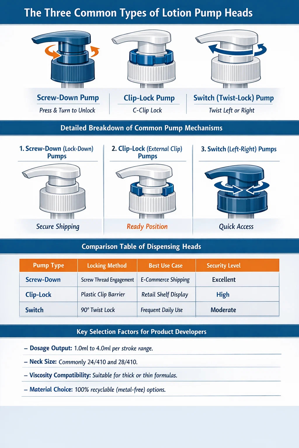 في صناعة التعبئة والتغليف، هذا المصطلح ما هي الأنواع الثلاثة الشائعة من المضخات؟ يشير على وجه التحديد إلى آليات القفل والتوزيع المستخدمة لتأمين السوائل. الأنواع الثلاثة الأكثر انتشارا هي المضخات اللولبية، ومضخات القفل المشبك، ومضخات التبديل (القفل الملتوي). . تم تصميم كل منها لمنع التسرب أثناء النقل مع توفير تجربة مستخدم محددة أثناء الاستخدام اليومي.